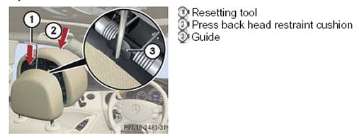 - Insert resetting tool (1) into guide (3), between the head restraint cushion and the rear head restraint cover.