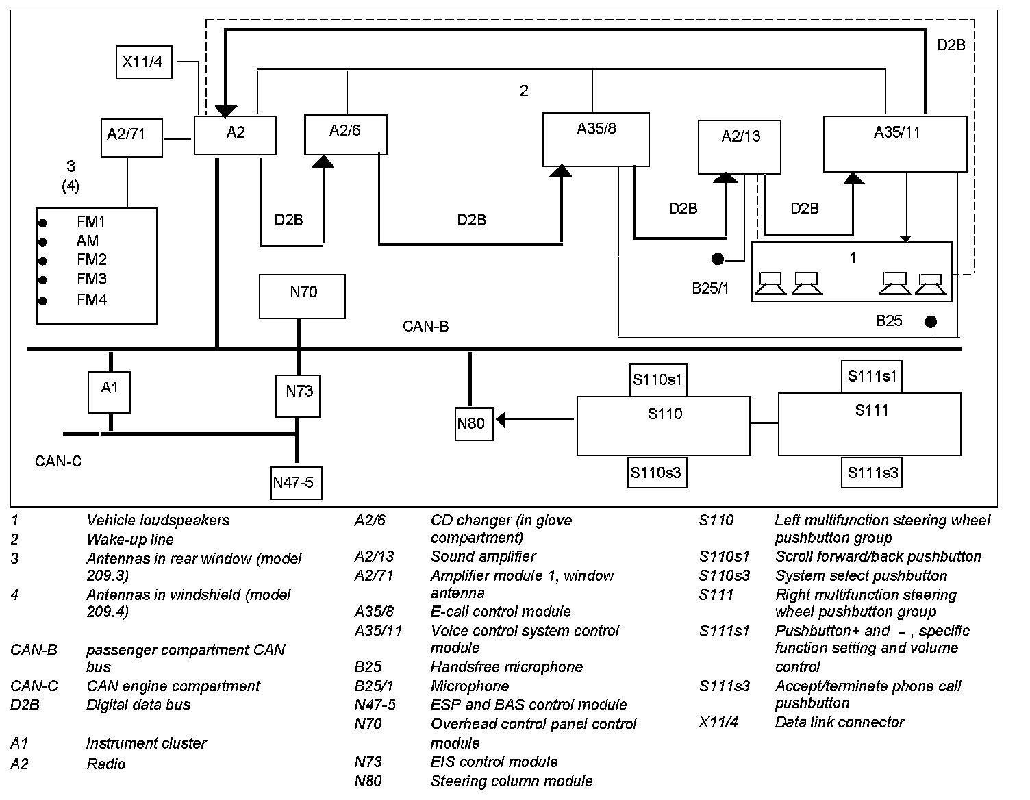 In the process it should be observed that all button operations on the multifunction steering wheel are first worked on by the instrument cluster (A1). The instrument cluster (A1) links the incoming key actuations with the current menu setting on the multifunction display (A1p13) and, where applicable, it sends a corresponding CAN message via the CAN interior (CAN-B) to the radio (A2).