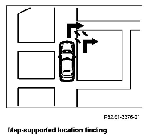 Continuous position finding is understood to refer to calculation of the vehicle's position at any given time. It is active when the ignition is switched on (circuit 15R ON) and is performed by the navigation processor, which is integrated into the COMAND operating, display and controller unit (A40/3). During the switch-on phase (software is loaded), only the basic position finding is available. After switching the ignition off (circuit 15R off), all important positioning parameters are stored for the duration of the run-on time (approx. 30 min).