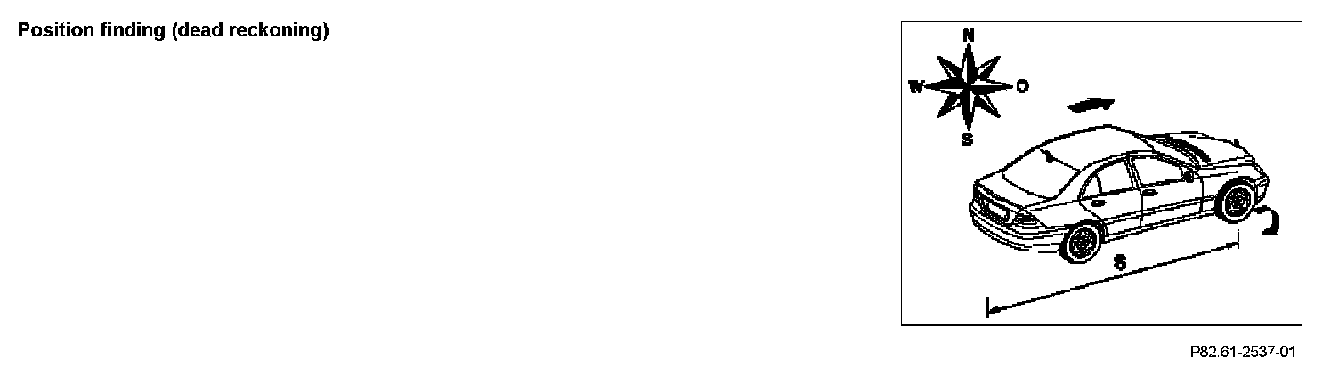 Basic location finding (dead reckoning) is the basic function of continuous location finding. This is performed by the navigation processor in the COMAND operating, display and control unit (A40/3) continuously when the ignition is switched on and is independent of the Compact Disc (CD) map. The current position is stored after the ignition is switched off. The following information is calculated with the aid of basic position finding: