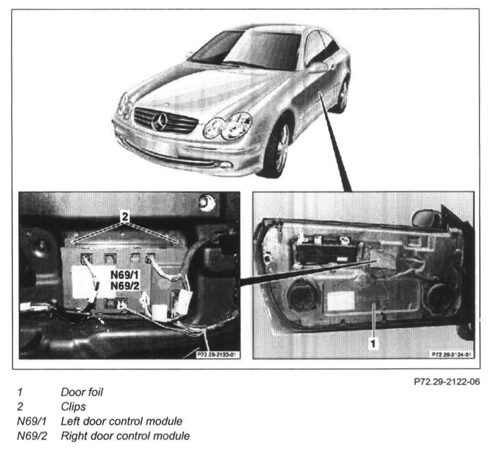 5 Press together clamps (2) and take out left door control module (N69/1), right door control module (N69/2)
