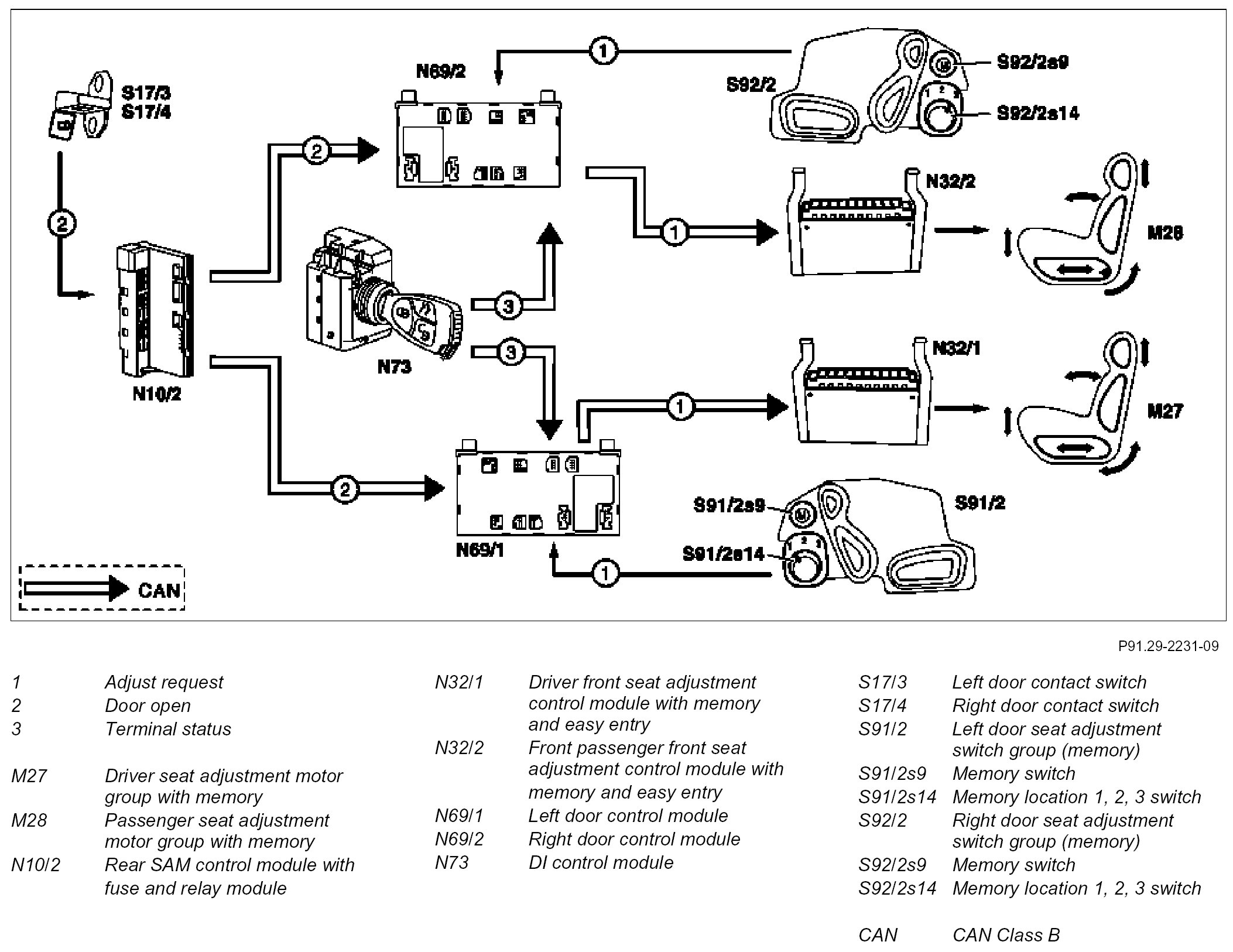 For circuit 15c On or circuit 15c Off the seat position can be stored with an opened door. The information, as to whether the door open or closed, is sent by the left door contact switch (S17/3) or the right door contact switch (S17/4) to the rear SAM control module with fuse and relay module (N10/2), which forwards the information via the CAN Class B.