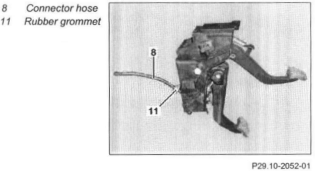 10 Pull out retaining clamp (9) at the connecting pipe of the master cylinder