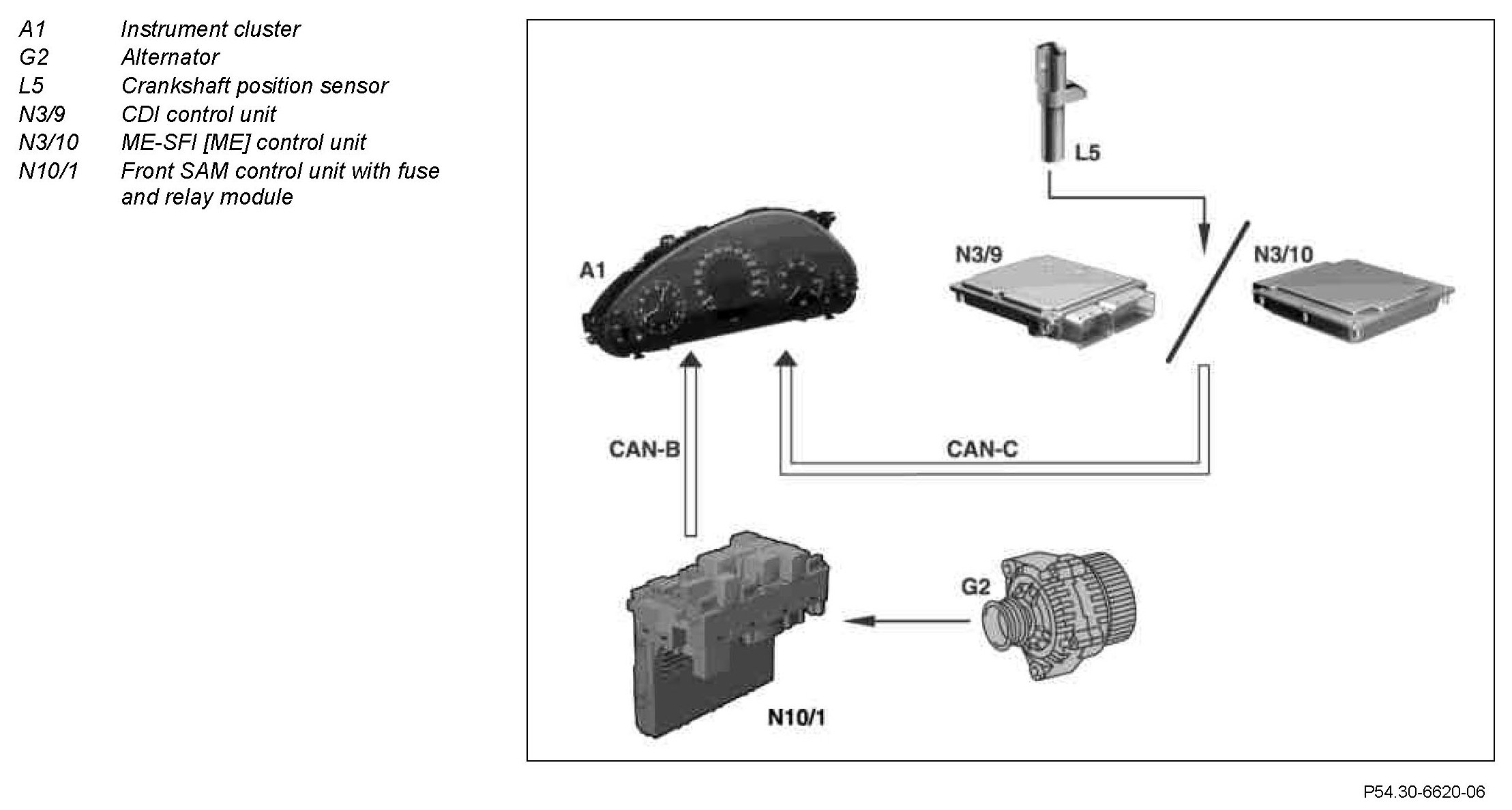 The CAN message "Circuit 61e" is placed by the instrument cluster (A1) on the Controller Area Network bus class C (engine compartment) (CAN-C) and as a result is available to the control units connected with CAN-C which need this CAN message.