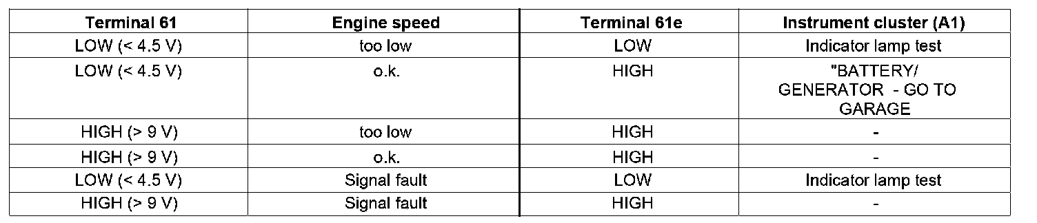 The instrument cluster (A1) links the Controller Area Network (data bus/CAN bus) (CAN) messages "Circuit 61" and "Engine speed" with the CAN message "Circuit 61e" (engine running detection). This CAN message can have either a "HIGH" or "LOW" status. The CAN message is "LOW" when circuit 61 is "LOW" and the engine speed is less than 200 rpm. The CAN message is "HIGH" if the engine speed is more than 200 rpm".