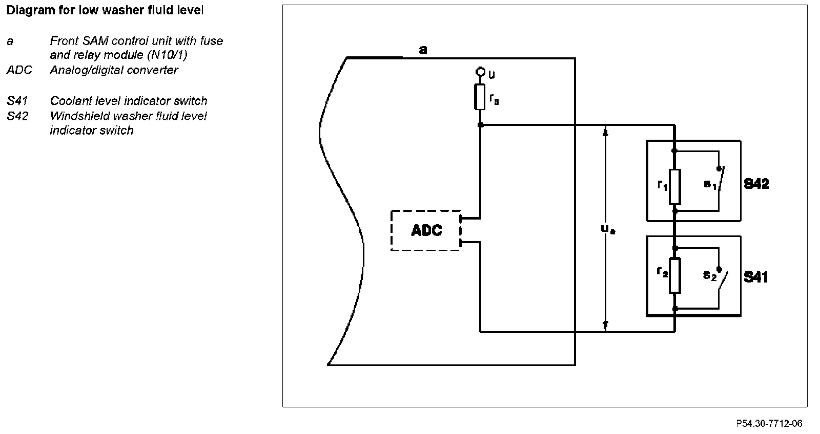 These resistors form, when the coolant level indicator switch (S41) and windshield washer fluid level indicator switch (S42) is open, together with "r3" from the front SAM control unit with fuse and relay module (N10/1), a voltage divider which is supplied with the constant voltage "u".