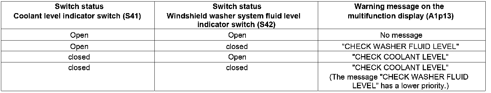 With the coolant level indicator switch (S41) and windshield washer fluid level indicator switch (S42) a total of 4 combination options of switch conditions of the coolant level indicator switch (S41) and the windshield washer fluid level indicator switch (S42) result (see table).