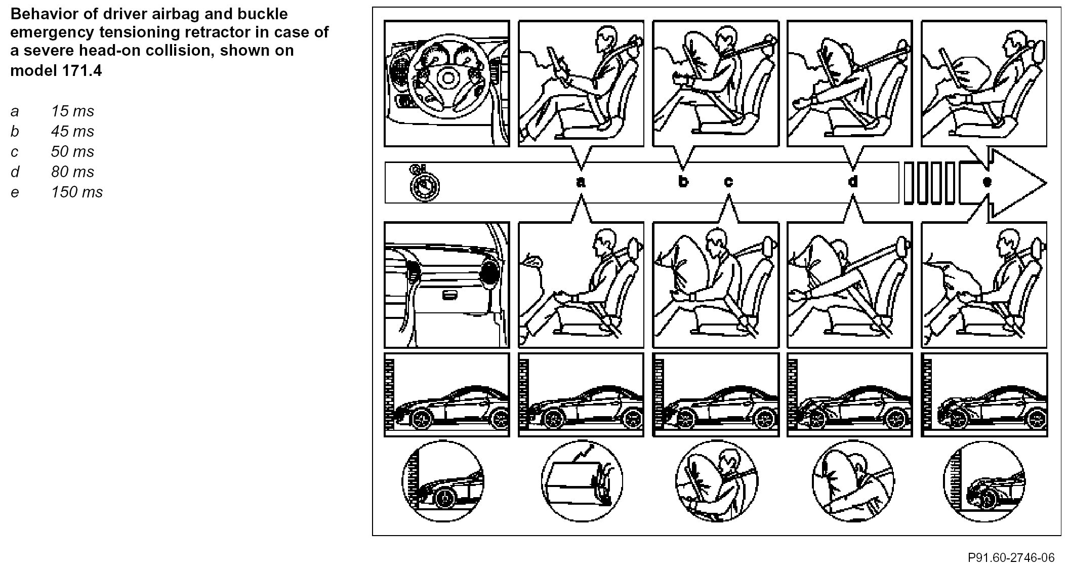 If a severe head-on collision occurs, the restraint systems control unit (N2/7) detects severe deceleration via the integral acceleration sensors. In this type of impact the airbag and seat belt system restraining functions in combination with the emergency tensioning retractors ensure the best possible degree of passenger safety.