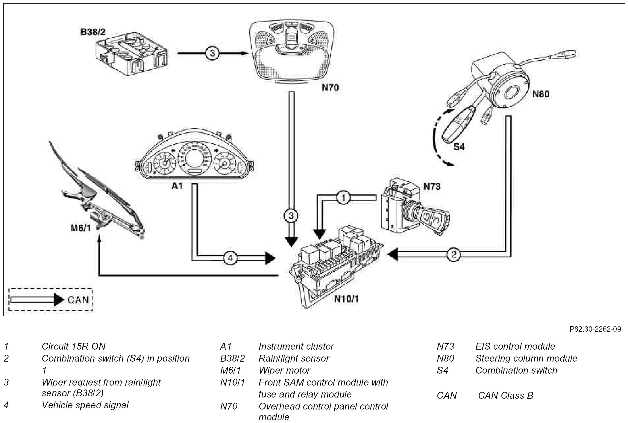 Data are not exchanged directly between the front SAM control module with fuse and relay module (N10/1) and the rain/light sensor (B38/2). The interface via the CAN-class B is the overhead control panel control module (N70).
