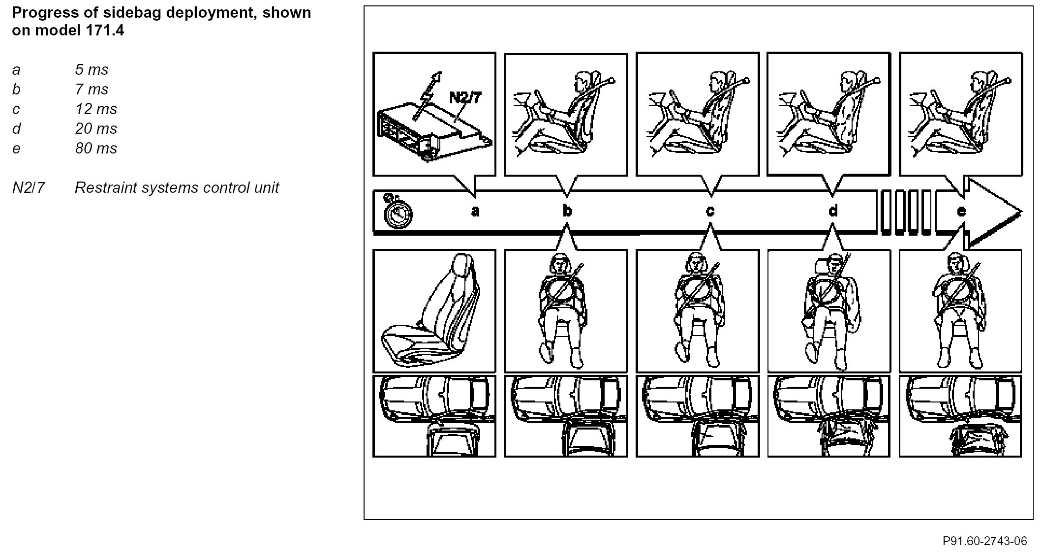 If a side impact is detected by the left sidebag and windowbag sensor (A53/1) or the right sidebag and windowbag sensor (A54/1), the lateral body acceleration data are transmitted to the restraint systems control unit (N2/7). The restraint systems control unit (N2/7) checks the plausibility of the data. If plausible, the following squibs are ignited in the event of a side collision from the left: