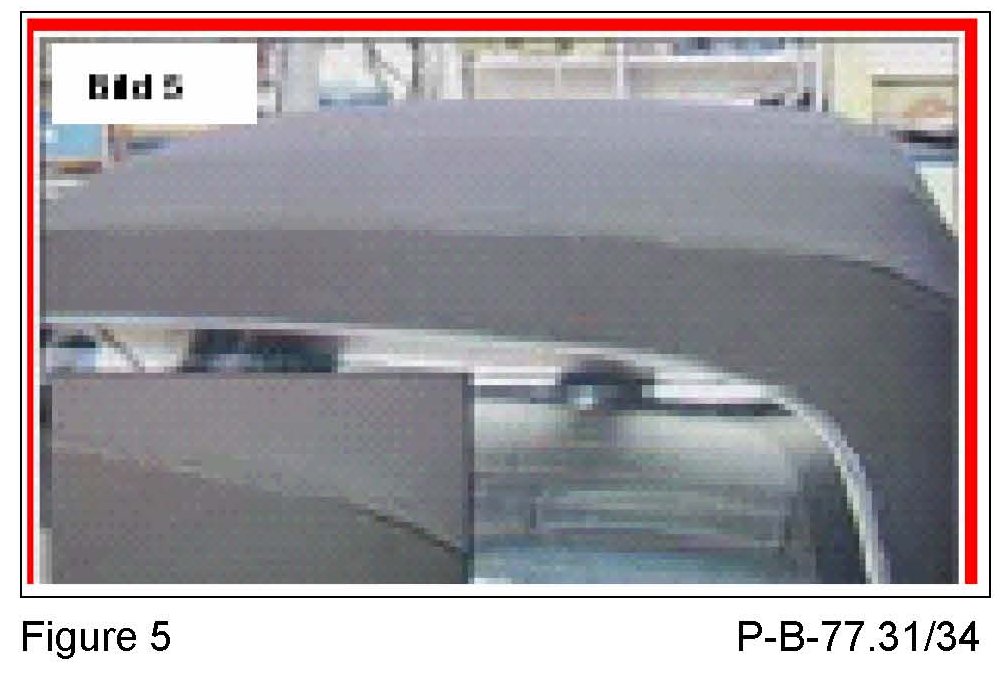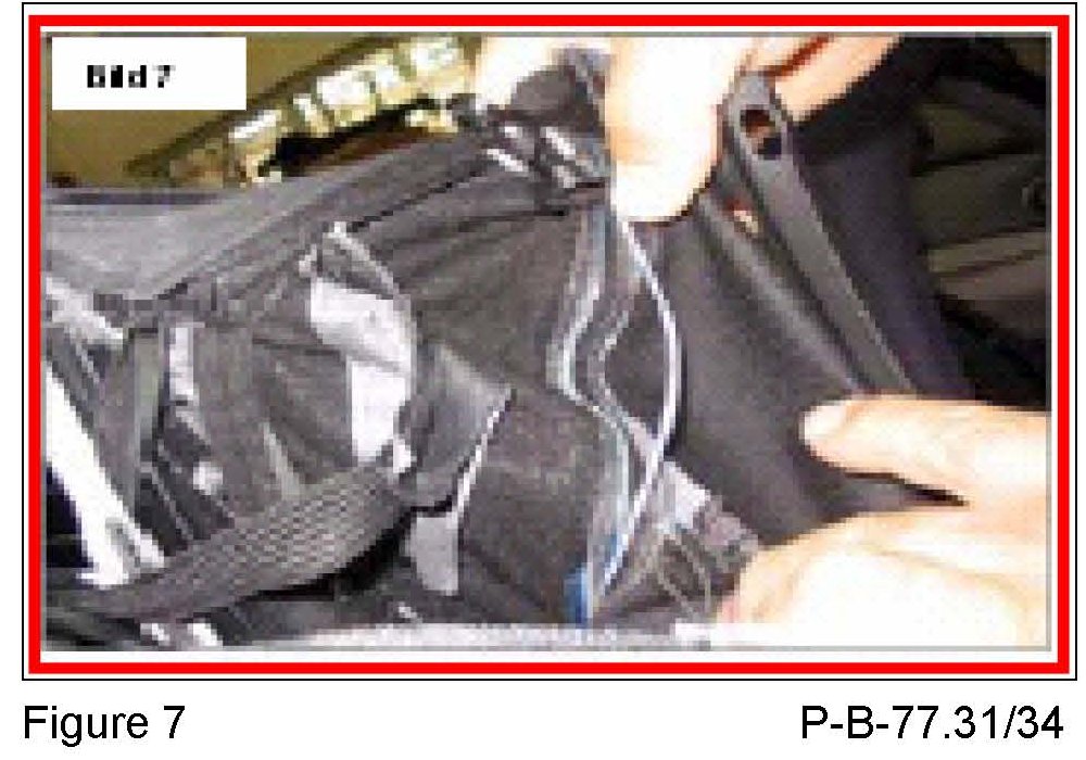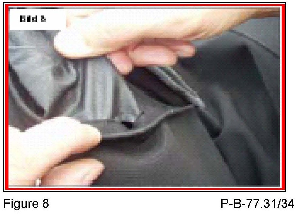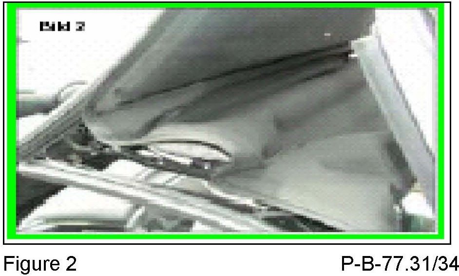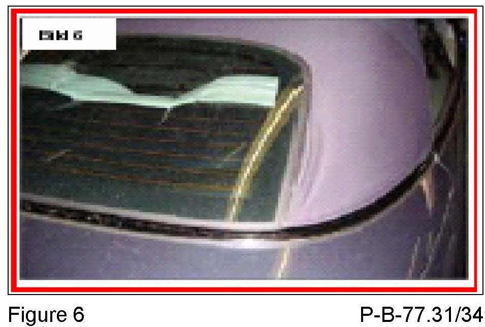 3. The edge of the soft top cover is not under the rear window molding (Figure 6) and the soft top cover around the rear window is loose. The weld seam on the guide for the tension cable (Figure 7) for the rear window has detached. Please perform repair as outlined in P-B-77.31/68 (or later version).