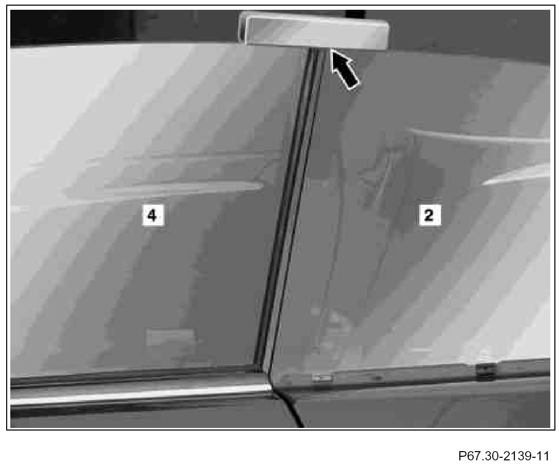11. Check whether door window (4) and rear side window (2) are flush with one another.