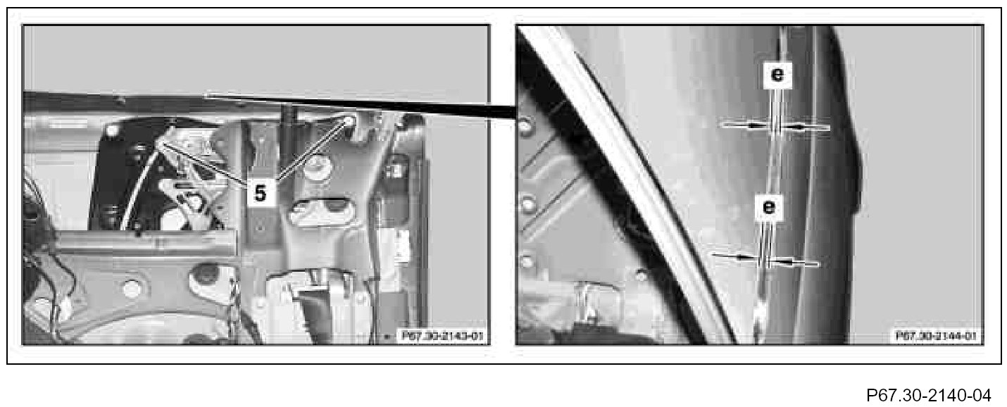 5. Lift rear side window (2) and lower and check dimension (e) again.