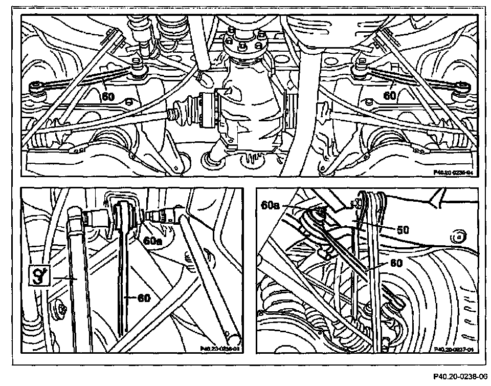 - Adjust toe-in with cam bolt (60a) on mounting of left and right track rod (60) on rear axle carrier (50)