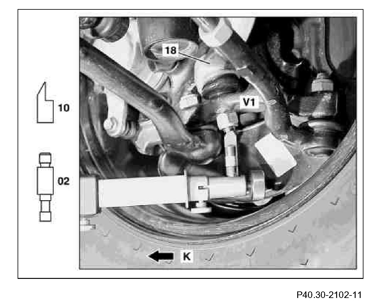 Measured from check bore (K) to the ball head bolt on the torque strut (18), left to right. The bearings at the tension arm and cross strut must be in perfect condition in order to assess the consequences of an accident. Because of the inaccuracies resulting from the tolerances of the bearings, the dimension (V1) is only usable to a certain extent.