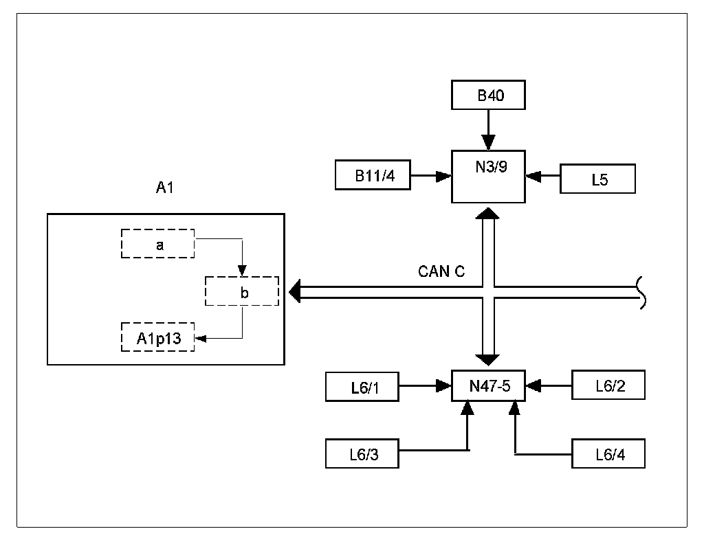 The ESP and BAS control unit (N47-5) uses the sensor's pulses to determine the wheel speeds and sends corresponding messages to the CAN-C. The instrument cluster (A1) receives these messages and uses them to determine the vehicle speed and the distance traveled.