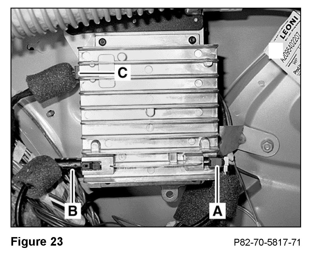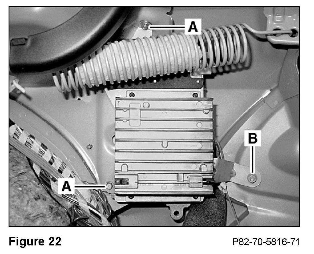 1. If sound system equipped, reconnect and reinstall the amplifier/bracket assembly, by connecting the power supply connector and MOST connector to the amplifier underside and reusing the 8 mm collar nut (A, Figure 3), 8 mm hex head bolt (B, Figure 3) to fasten the bracket.2. Place the MHI/linear compensator/antenna splitter bracket assembly near its mounting place (Figure 21).