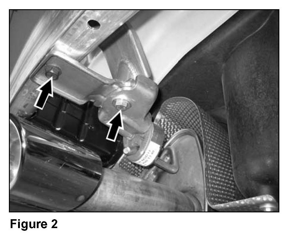 2. Remove old bracket set (A, Figure 1) from cross member. Remove the three bolts (arrows, Figures 1 and 2) holding brackets in place.