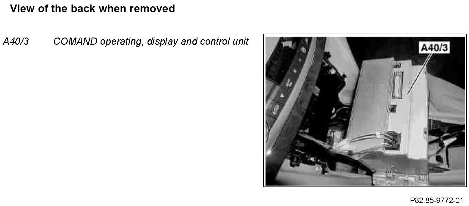 The COMAND operating, display and control unit (A40/3) is installed in the 2-DIN opening in the center console between the operating module for the interior air conditioning and the upper control panel.