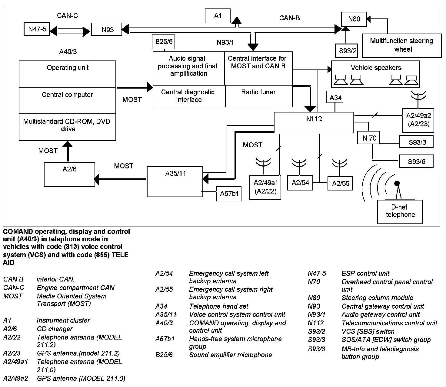 The voice control system control unit (A35/11) is connected to the COMAND operating, display and control unit (A40/3) via the Media Oriented System Transport (MOST). In vehicles with code (813) voice control system (VCS) it is used to operate the telephone and for certain audio operations (e.g. radio station search function, CD track change function, etc.). The audio source is automatically muted during a telephone call. It is possible to listen to the telephone call via the vehicle speakers.