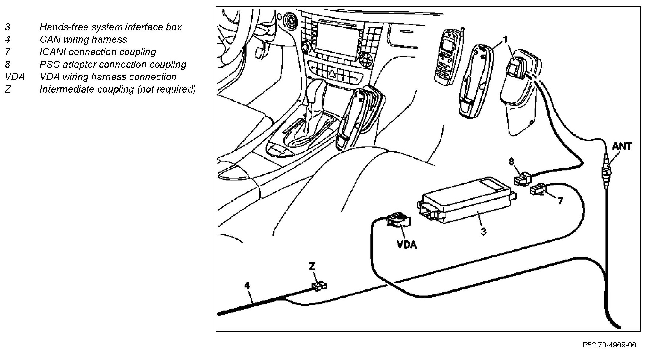 6 Route connector coupling (8) from the telephone bracket to the hands-free system interface box (3) and connect to hands-free system interface box (3) as shown in the figure.