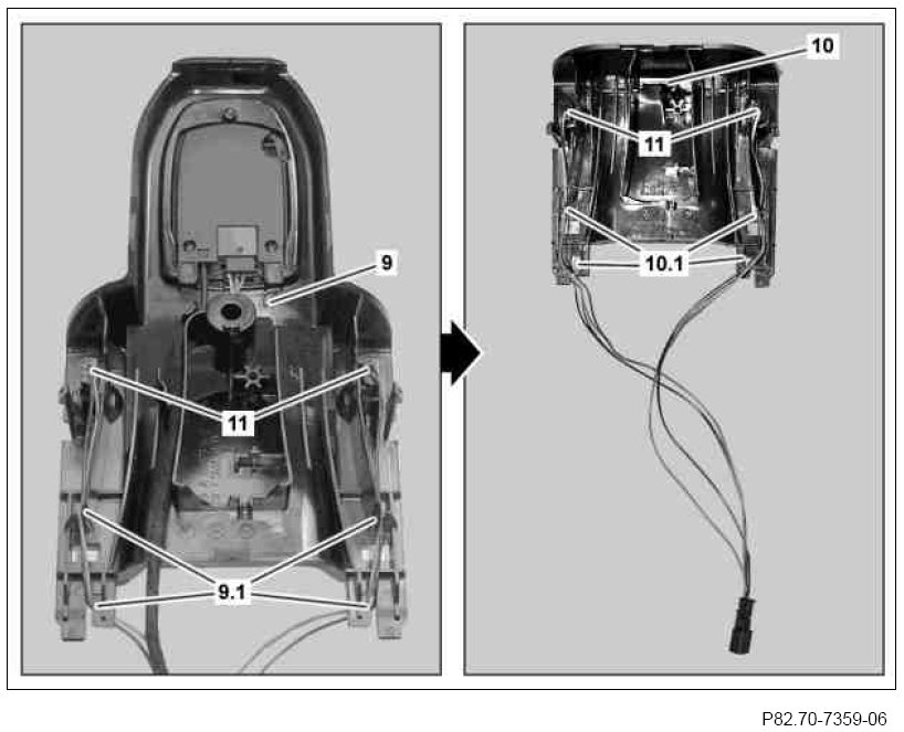 10 Expose wiring harness for illumination of stowage compartment in center console from holders (9.1) of covering (9).