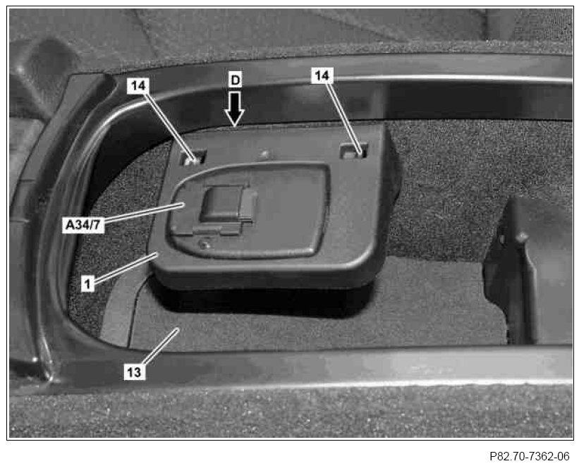 Make sure that the extension for the Bluetooth module wiring harness and the Bluetooth module antenna line are routed into the guide (arrow D) of the mounting console (1), as otherwise the mounting console (1) could be damaged when tightening.