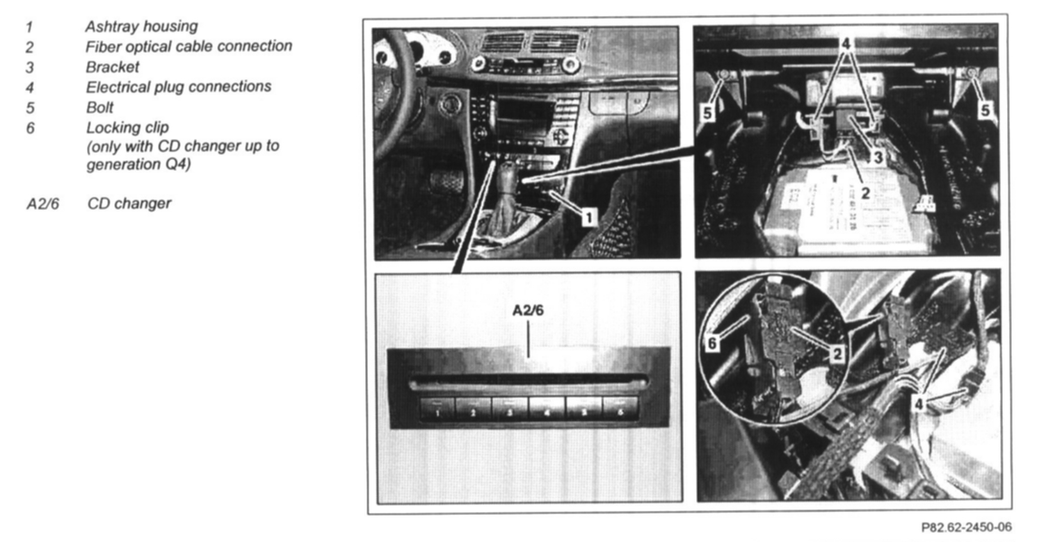 5 Pull the CD changer (A2/6) from the center console until the fiber optic cable coupling (2) and the electrical connectors (4) are accessible
