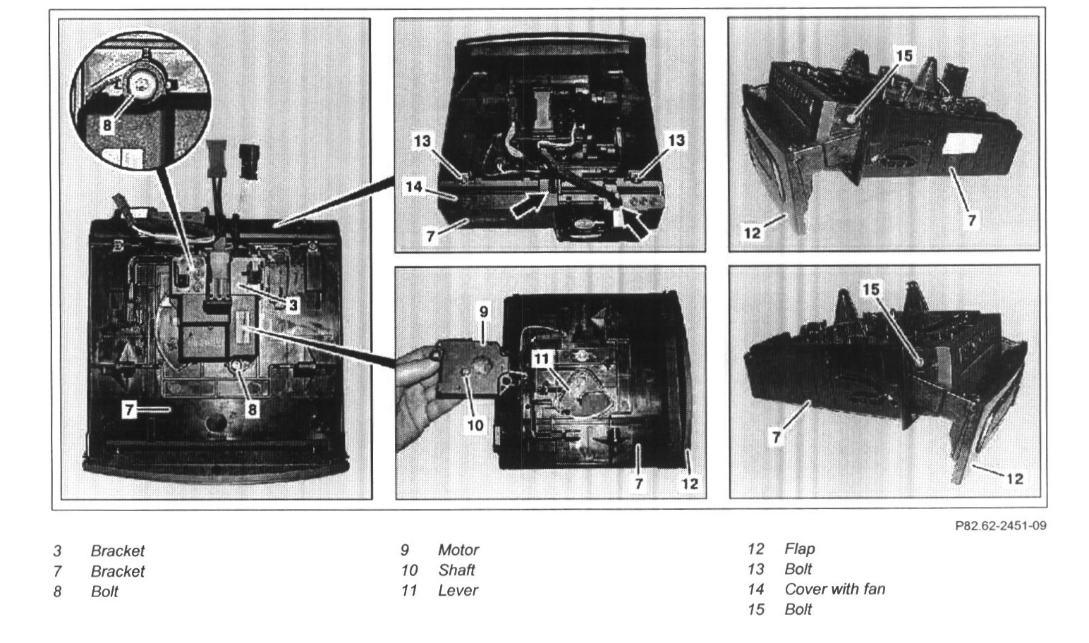 12 Unscrew bolts (8) and detach motor (9) from lever (11) of bracket (7)