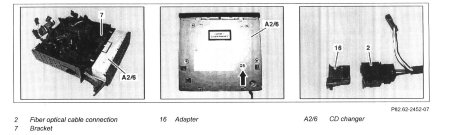 NOTE: Installation: When exchanging the CD changer (A2/6) up to generation Q4 for one as of generation Q5 (arrow), insert adapter (16) into the fiber optical cable coupling (2).The adapter is available (16) as a replacement part.