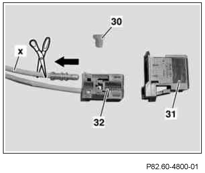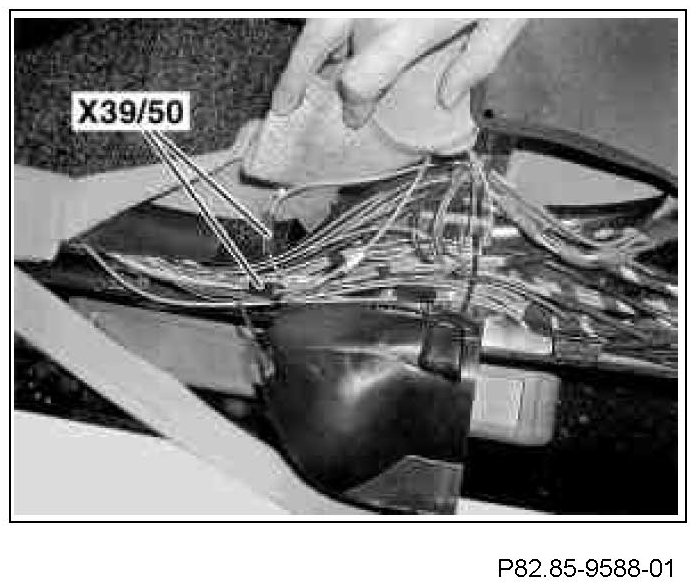11 Remove the damaged fiber optical cable module 4 from the fiber optical cable connector (MOST) (X39/50), separate and strap down using insulation tape.