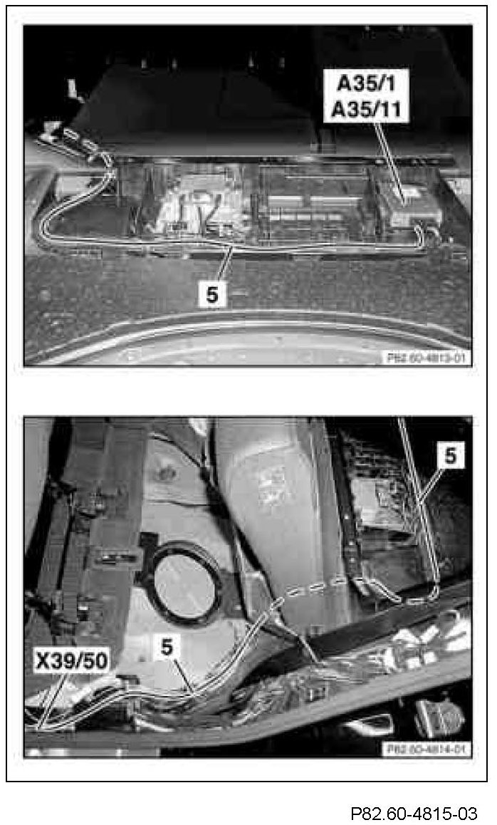 5.2 Route new fiber optical cable module (5) from the connector for hands-free system control unit (A35/1) or voice control system control unit (A35/11) along existing the fiber optical cable connector (MOST) (X39/50).