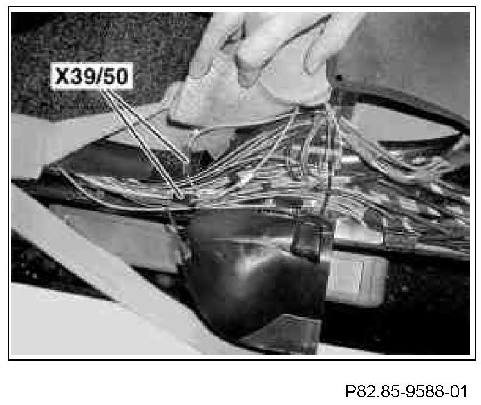 8 Remove the damaged fiber optical cable module 5 from the fiber optical cable connector (MOST) (X39/50), separate and strap down using insulation tape.