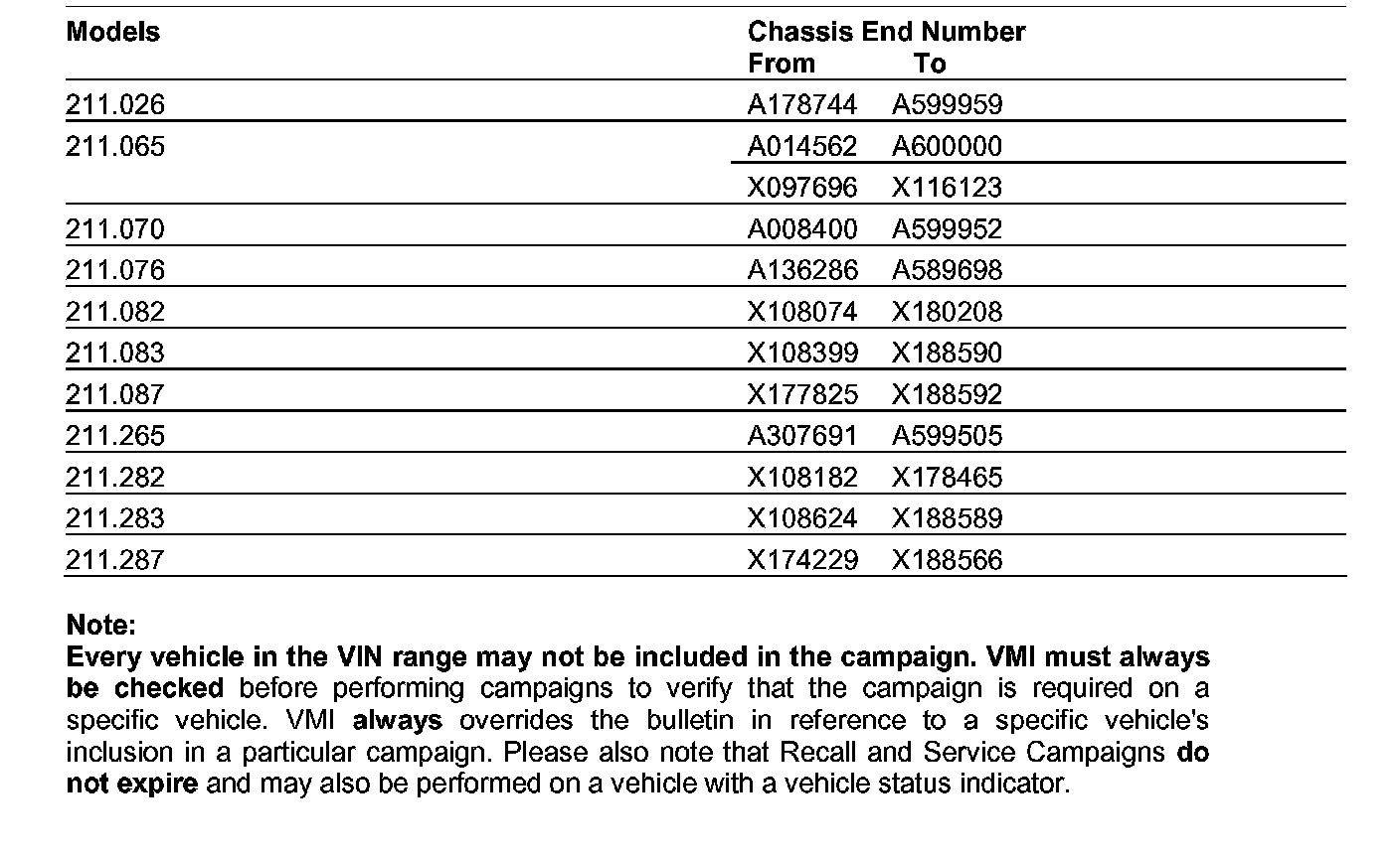 This Service Campaign has been initiated because DCAG has determined that on the affected vehicles (see VIN range on the following page) dirt can collect in the rear sleeves on the front axle carrier. Dealer will clean the rear sleeves and install new bolts and washers.