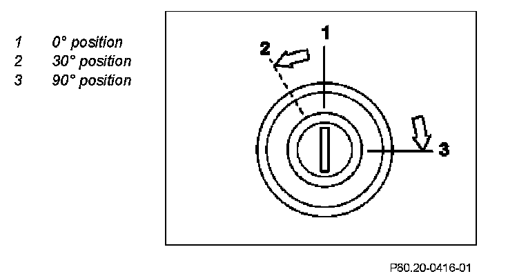 If the locking cylinder in the trunk lid is in the 0° position (1), pulling the trunk lid external operation switch (S88/8) electrically actuates the trunk lid lock when the vehicle is unlocked globally. Otherwise the mechanical key must be held in the 30° position (2) and the trunk lid external operation switch (S88/8) must be pulled to open the trunk lid mechanically. If the lock cylinder is in the 90° position (3) opening is not possible.