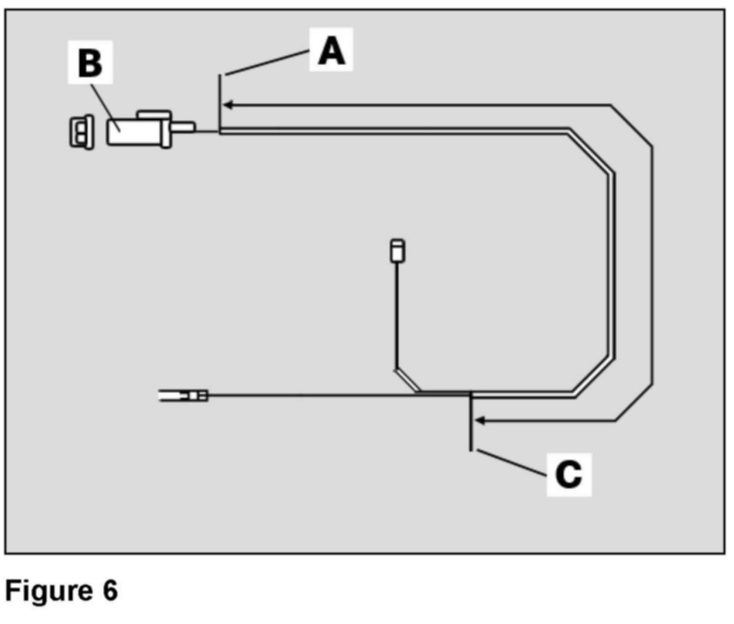 14. Wrap the brown wire and black wire together with the included electrical tape starting 30 mm (A, Figure 6) from the connector (B, Figure 6) for the trunk lid microswitch and back 1,600 mm (C, Figure 6).