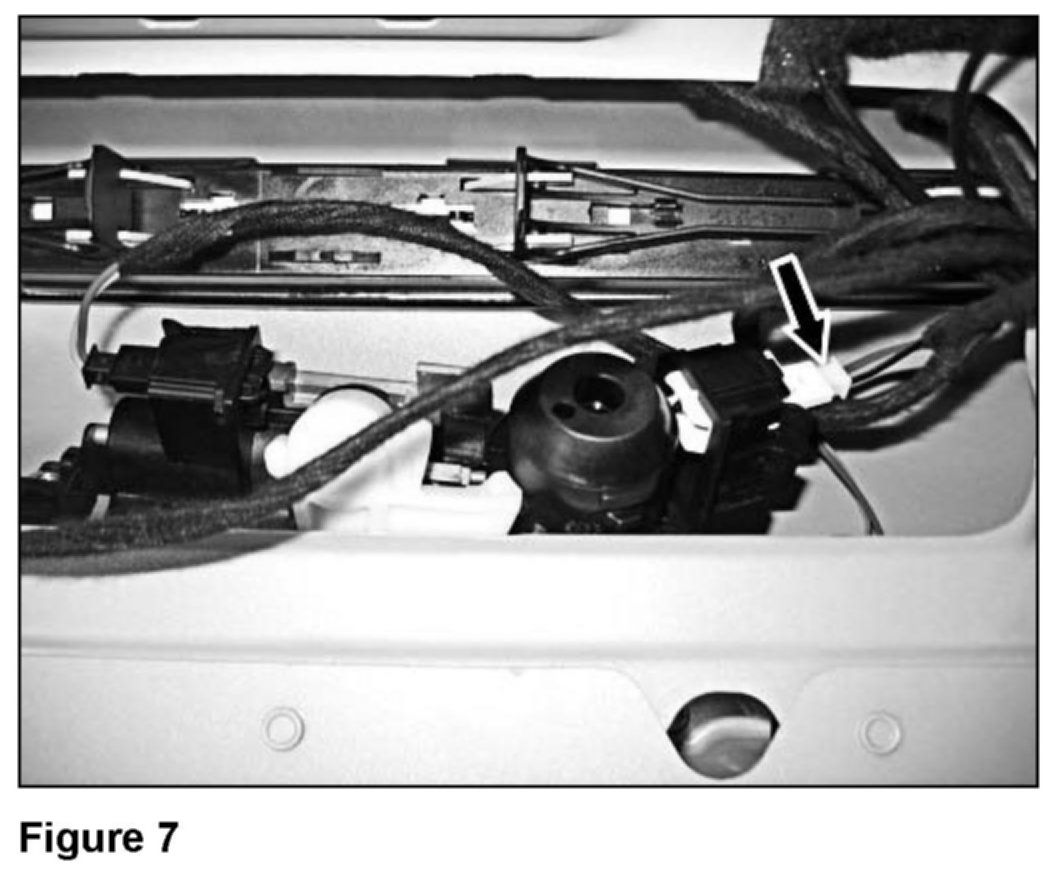 15. Connect the new wiring harness (B, Figure 6) to the microswitch (Figure 2) in the housing for the trunk lid lock (Figure 7).