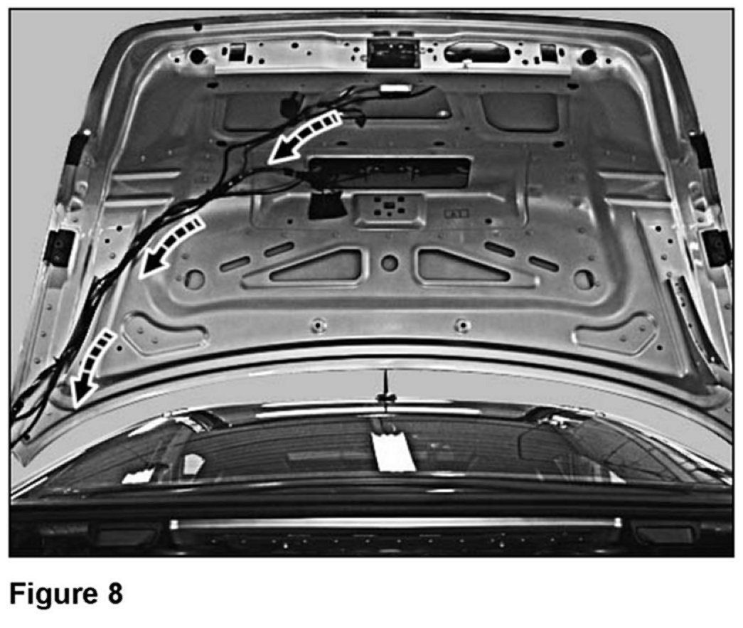 17. Route, and secure with wire ties, the new wiring harness (Figure 8) along the existing wiring harness running down the left side of the trunk lid.