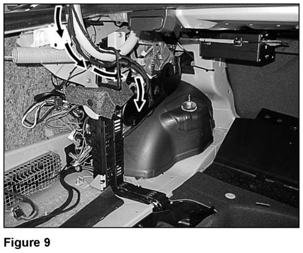 18. Continue routing, and securing with wire ties, the new wiring harness along the existing wiring harness running down the left hinge bracket for the trunk lid (Figure 9).