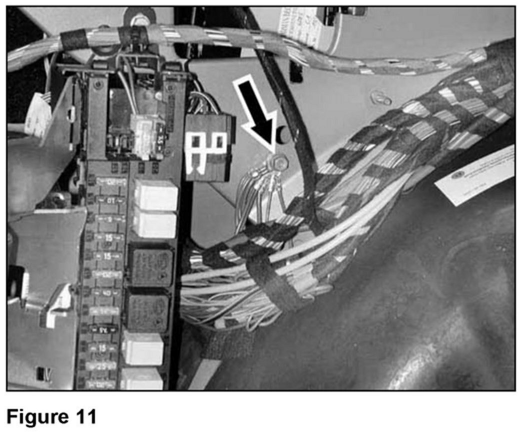 20. Connect the brown ground wire (B, Figure 3) of the new wiring harness to ground-point "W6" (Figure 11) exposed by the plastic cover removed in step 19.