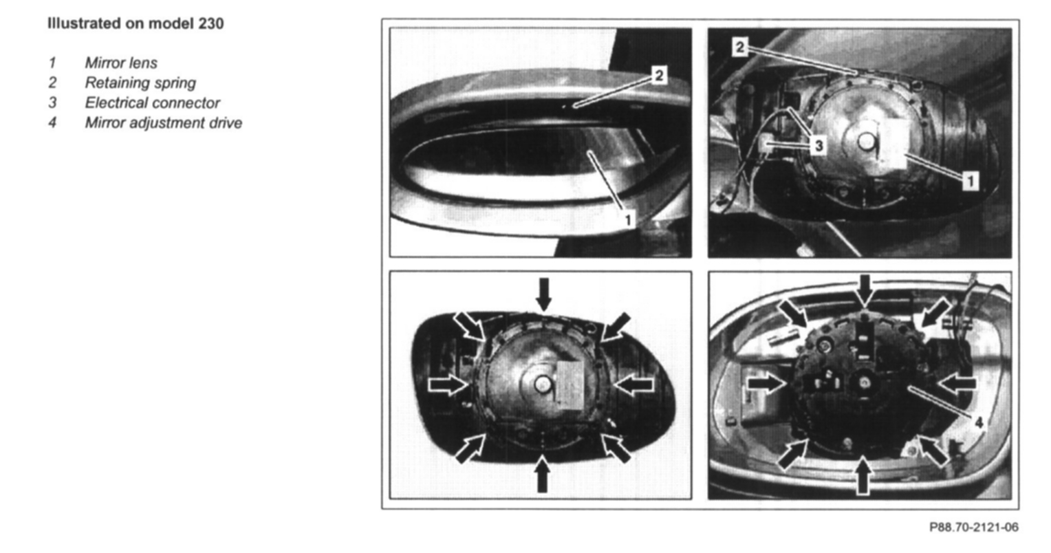 NOTE: Installation: Clip on mirror glass (1) from bottom to top at mirror adjustment drive (4) At the same time observe the retaining spring and the fixtures (arrows) at the mirror glass (1) and the mirror adjustment drive (4)