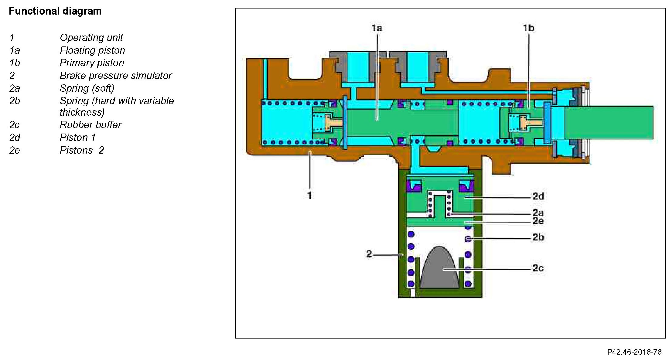 2. If the brake pedal is operated further, then the harder spring (2b) is compressed via the piston 2 (2e). The pressure of this spring increases progressively.
