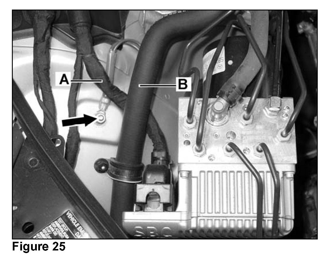 ^ Ensure ground wires (A Figure 26) are completely wrapped with fabric tape (as performed in step 15) in the area adjacent to the SBC hydraulic unit bracket (B) to ensure that the ground wires do not become chafed. Readjust tape as necessary to prevent chafing.