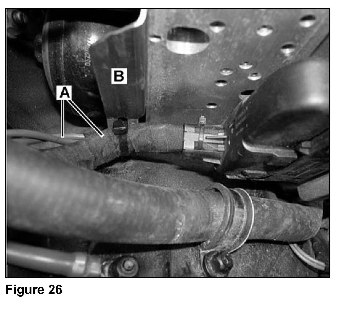 ^ Ensure wiring harness (A, Figure 25) and water hose (B, Figure 25) are not touching each other.