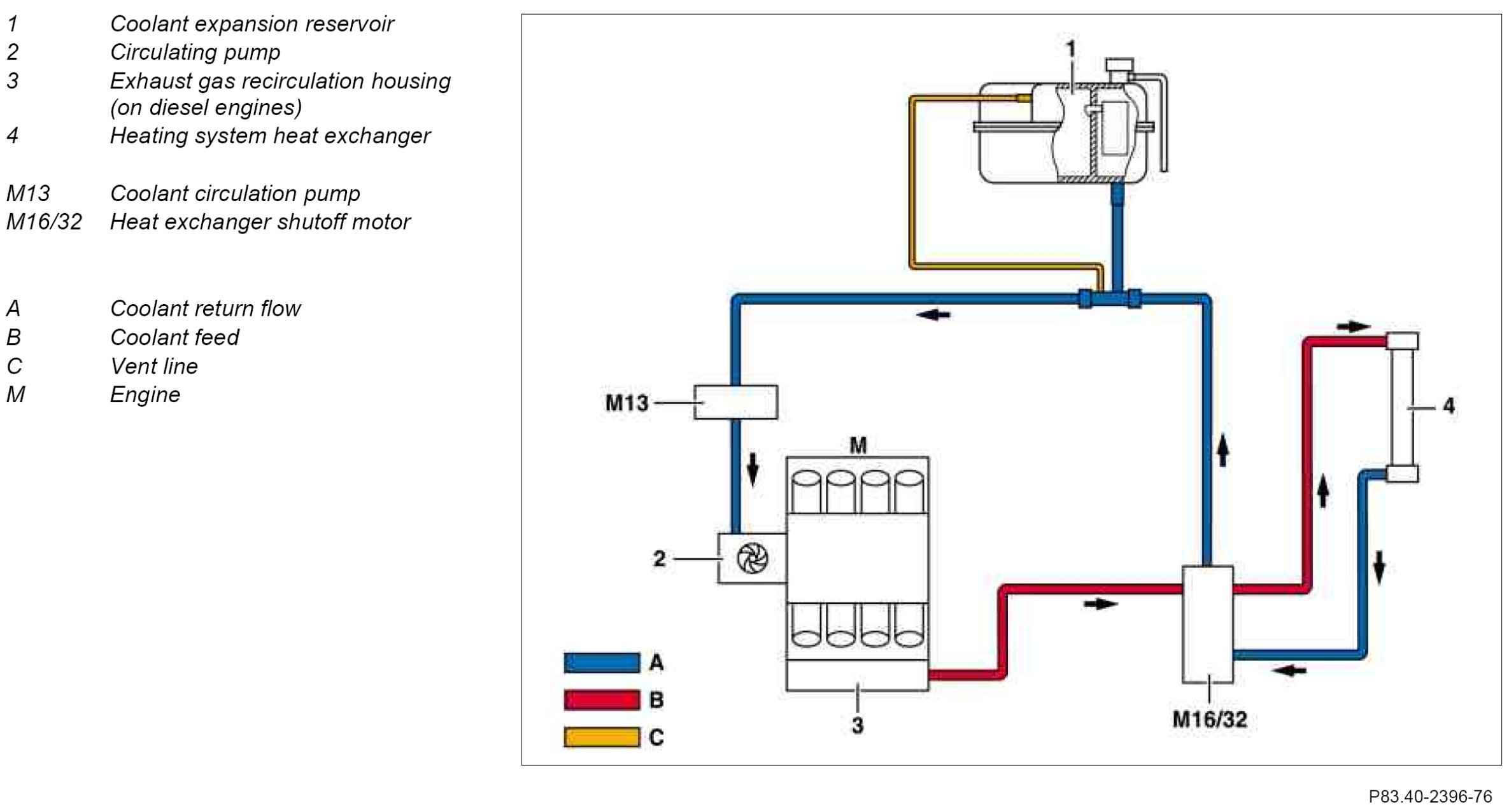 The coolant pump (2) pumps cold coolant through the engine (M). The coolant absorbs the engine's heat and becomes heated. In vehicles with diesel engines, the coolant also flows through the exhaust gas recirculation housing (3). Shortly afterwards the heated coolant is routed through the heat exchanger (4), where the heat is dissipated to the passenger compartment air.