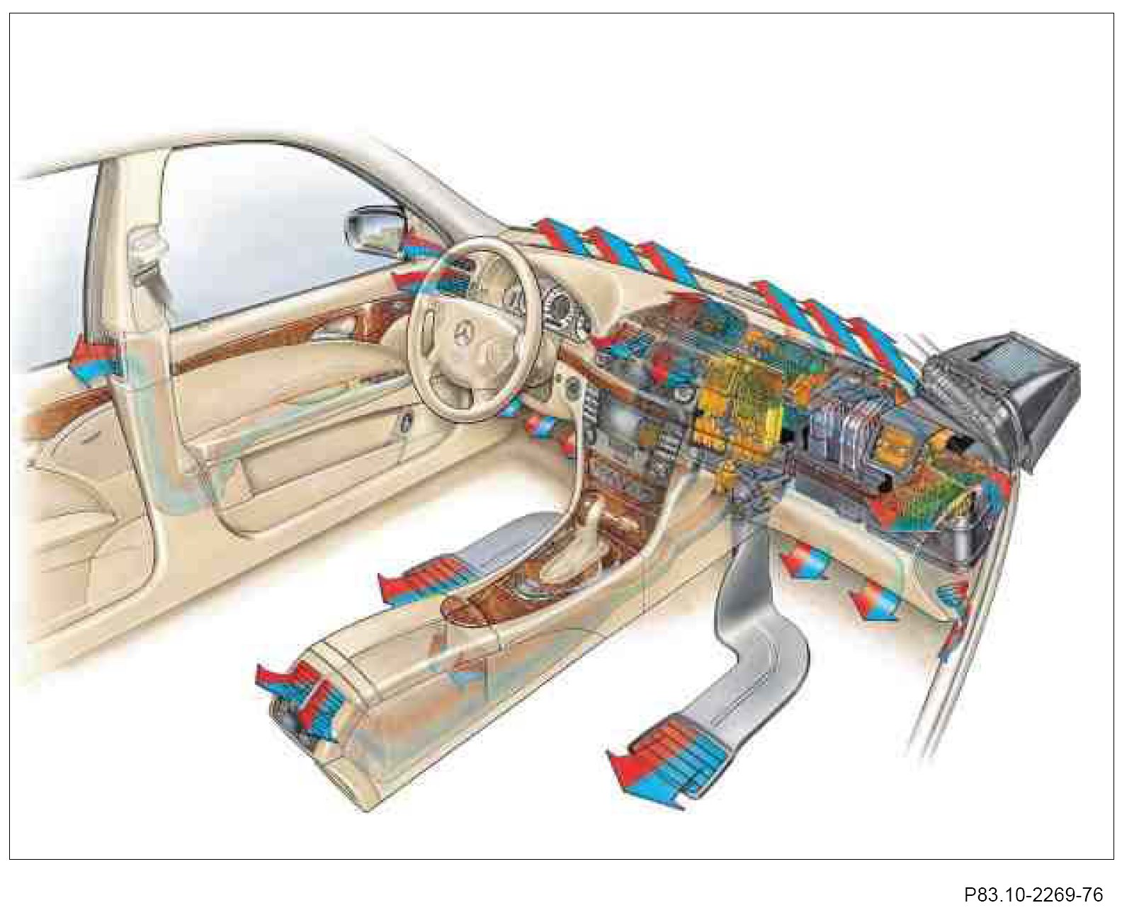 Depending on the setting selected, the aspirated air is routed through the air conditioner housing and the air ducts to the air outlets in the interior.