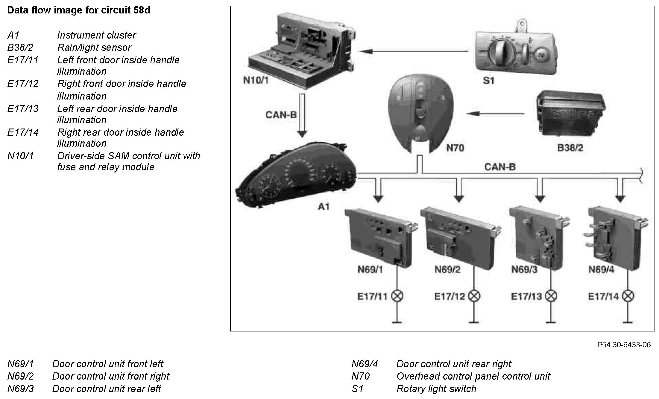 When the standing lamp switched on the position of the instrument illumination brightness control and reset button (A1r1) is used as a controlled variable by the overhead control panel control unit (N70), the rain/light sensor (B38/2) is not taken into account. If automatic running lights are set the intensity of the switch and controls illumination is determined by the rain/light sensor (B38/2). Its signals are evaluated by the overhead control panel control unit (N70) and placed on the Controller Area Network bus Class B (interior) (CAN-B).