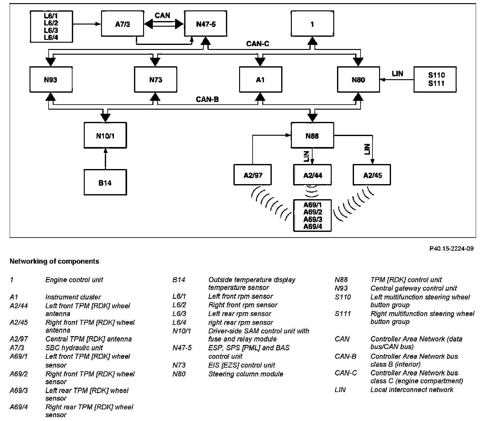 While driving the left front, right front, left rear and right rear TPM [RDK] wheel sensors transmit three data telegrams every 60 seconds. These data telegrams transmit the absolute pressure, the wheel temperature, the acceleration, the ID and status information on the manufacturer, frequency, pressure range etc. The tire pressuring measuring range extends from 0 to 5.5 bar (relative pressure).