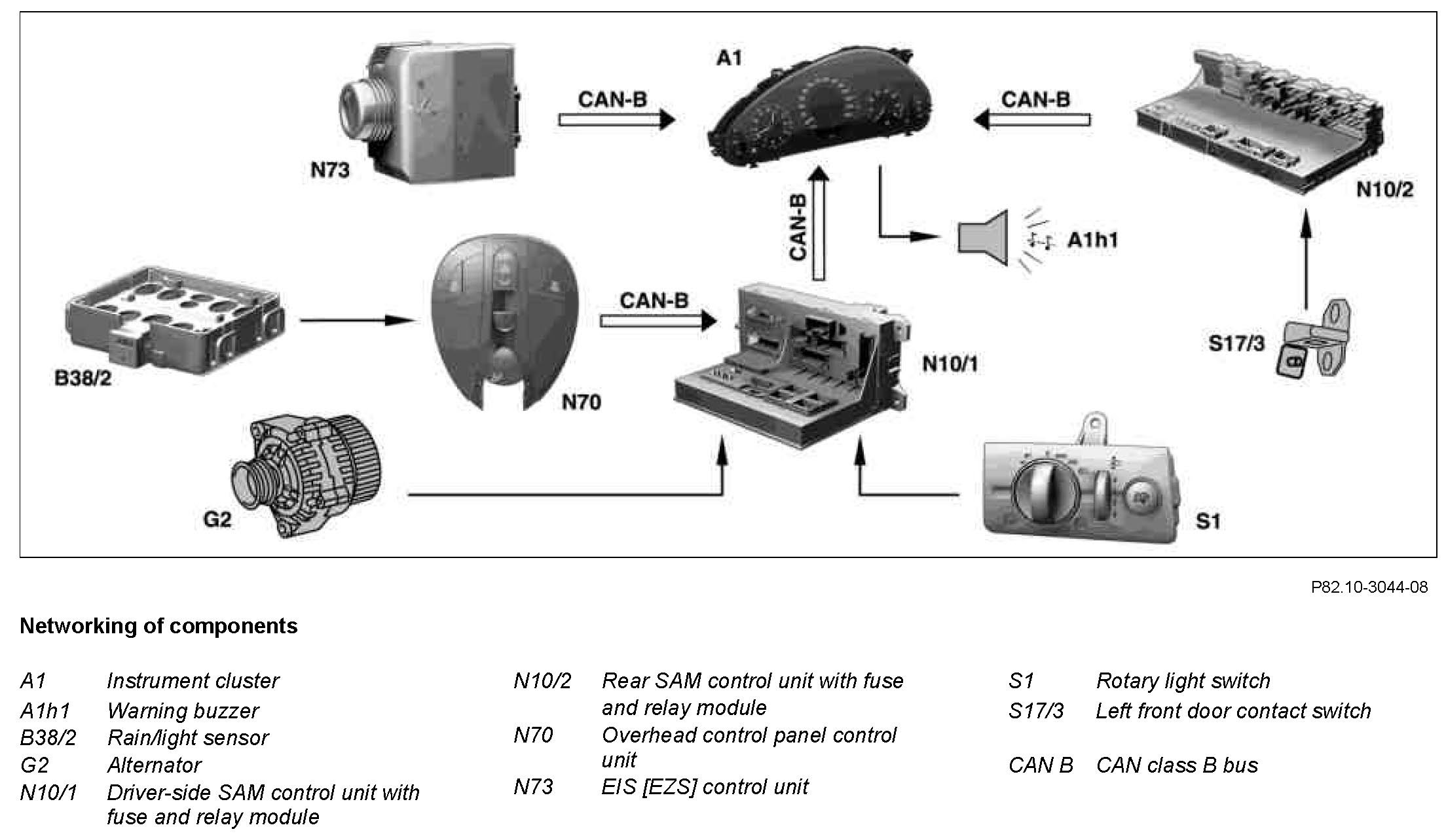 The rear SAM control unit with fuse and relay module (N10/2) recognizes that the door is open from the signal of the left front door contact switch (S17/3) and transmits the CAN message "door open" to the instrument cluster (A1) via CAN class B.