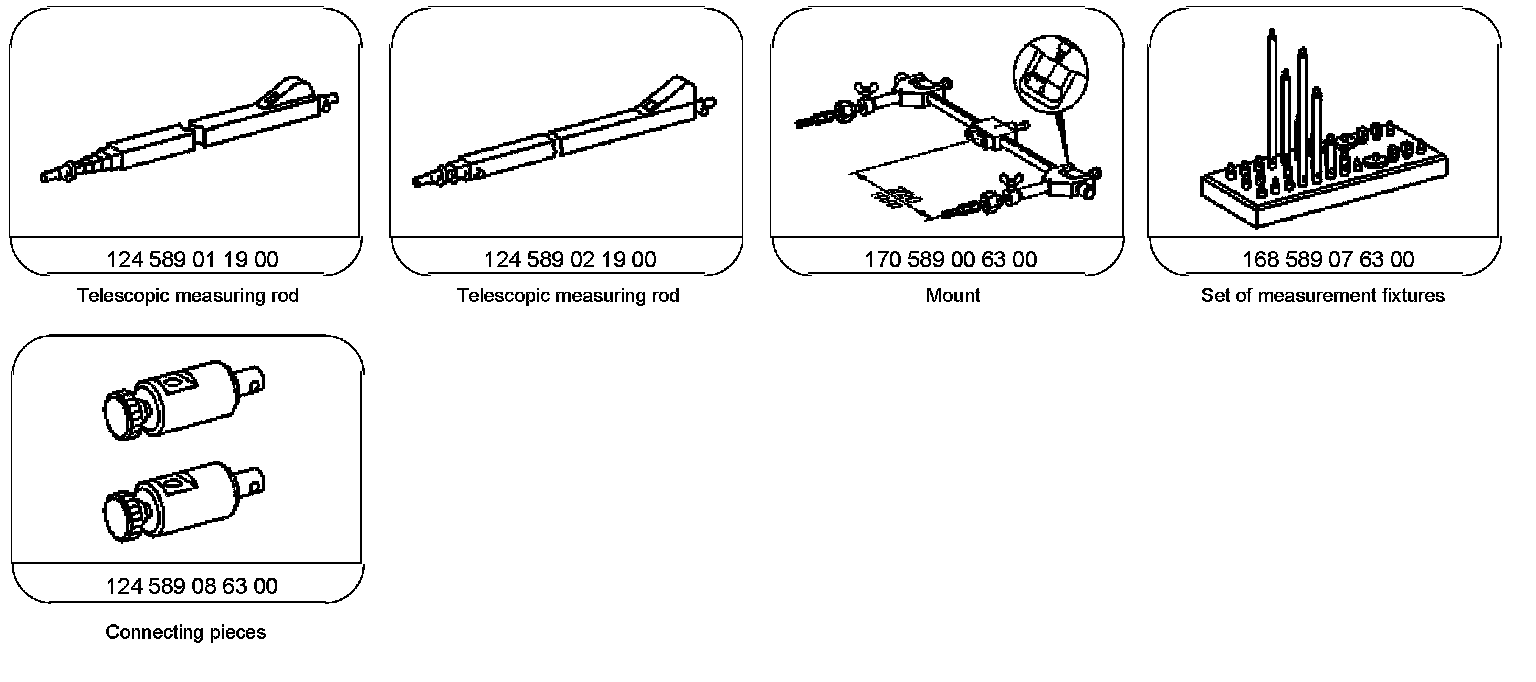 The measuring set is designed in such a way, that the measuring bolts, according to the measuring points at the vehicle, can be screwed together out of mounting bolts, extensions and measuring tips/bolts.